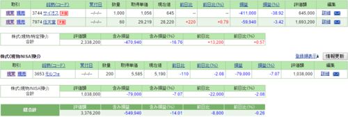 今週末時点での株式総資産は3,376,200円。前週比-348,800円(-9.4%)となった。 モルフォを200株、テクノスジャパンを500株売却して、任天堂株を単元未満株で60株購入した。 私はポケモンGOの熱狂ぶりを見るたびに、どうしてもこのワクワクを共有できないこ…